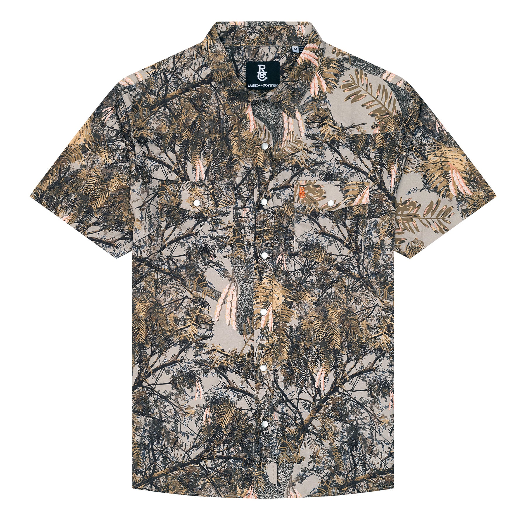 Our Mesquite Camo pearl snap features a mesquite tree camouflage pattern, pearl snap button down, and embroidered RBC brand on the front pocket in safety orange. Available in short and long sleeve.