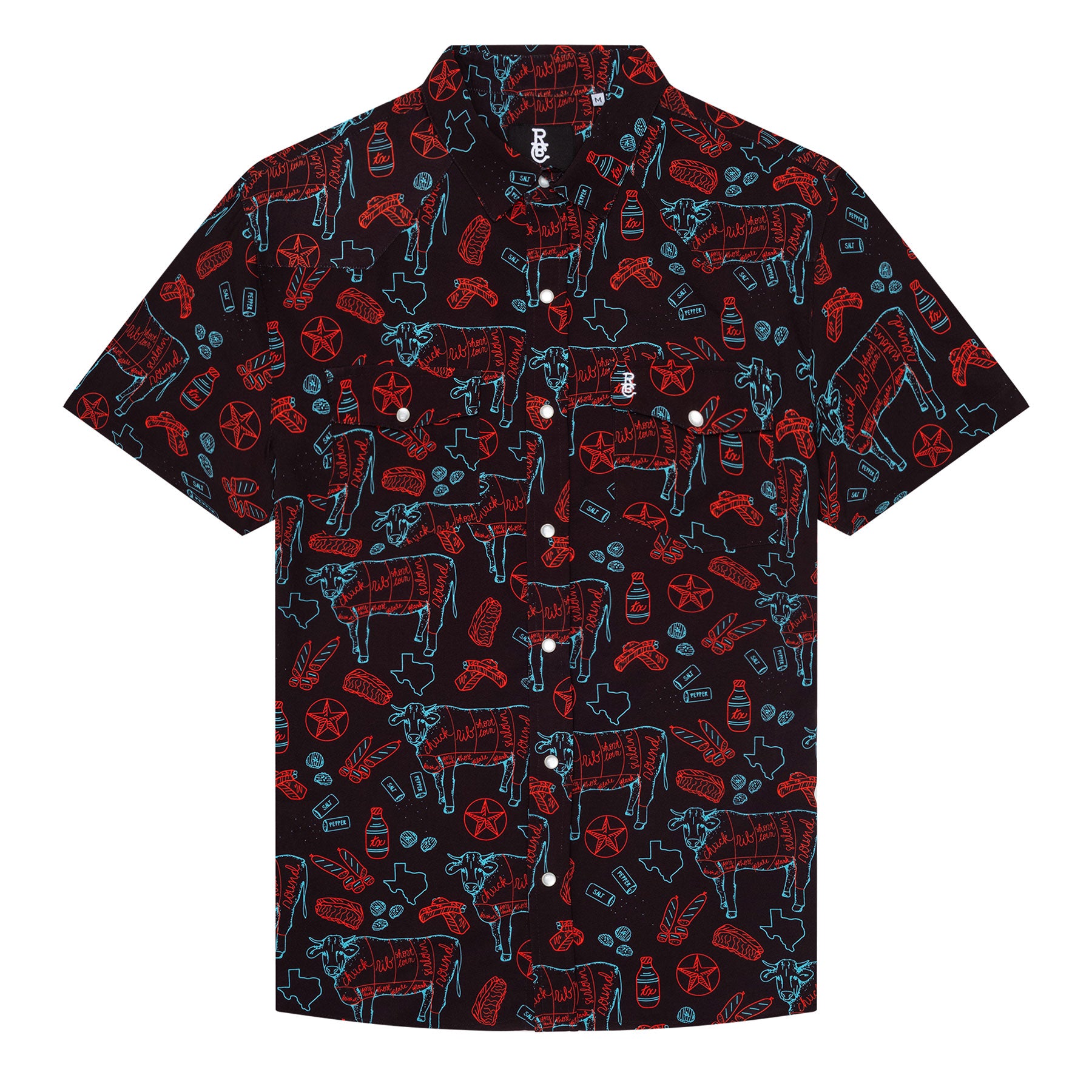 Our TX BBQ Nights pearl snap western shirt features a beef cuts chart, brisket, ribs, sausage and fixin's pattern, pearl snap button down, and embroidered coyote head on the front pocket.